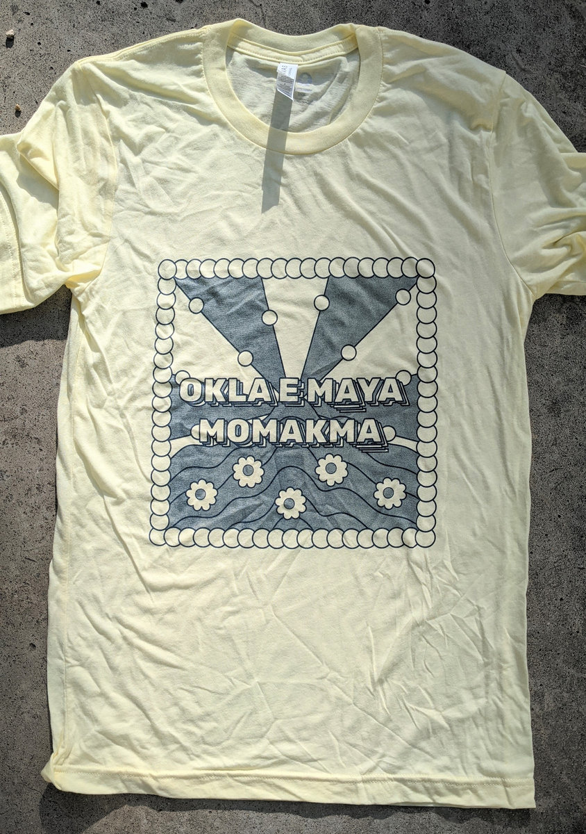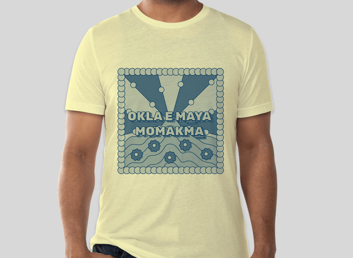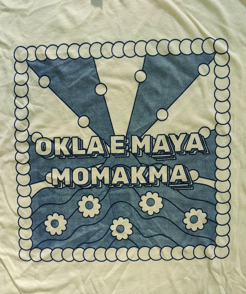 vintage pale yellow Canvas tri-blend shirt with navy print. Choctaw language from the song "When We Remain". unisex and very soft. Design by Meinhaus